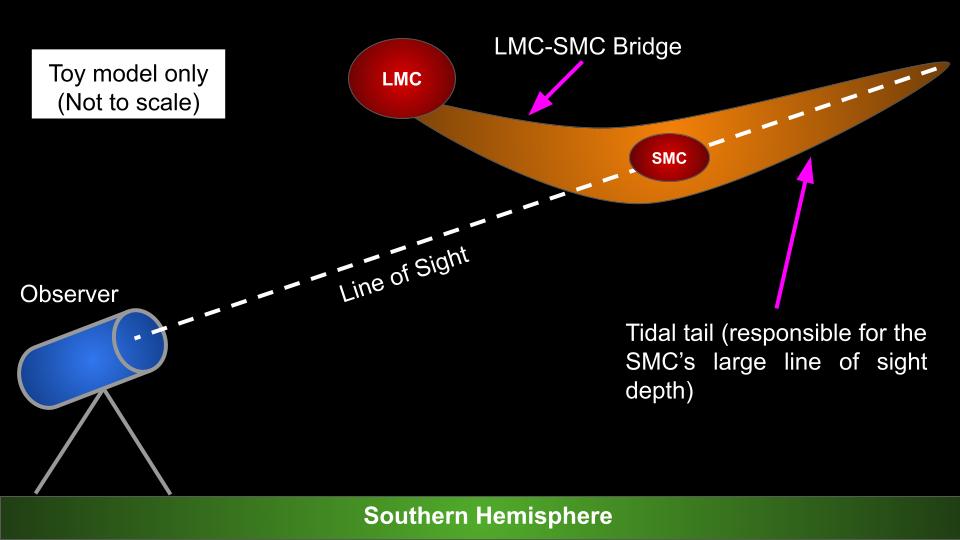 Despite a wealth of observations, interpreting the SMC’s structure & kinematics has been a challenge. The SMC’s gas exhibits a substantial velocity gradient, yet the stars show minimal rotation. The SMC has an on-sky stellar extent of a few kpc, yet its line of sight depth is > 10 kpc, and the stellar and gas centers are separated by > 1 kpc. The SMC is clearly in a very high state of disequilibrium. Using hydrodynamic simulations, in Rathore+2025(c), we showed that the SMC’s disequilibrium can be attributed to a recent (< 200 Million years ago) direct collision between the SMC and LMC. Tidal forces and ram pressure exerted by the LMC transforms the SMC from a rotationally supported to a dispersion dominated galaxy.